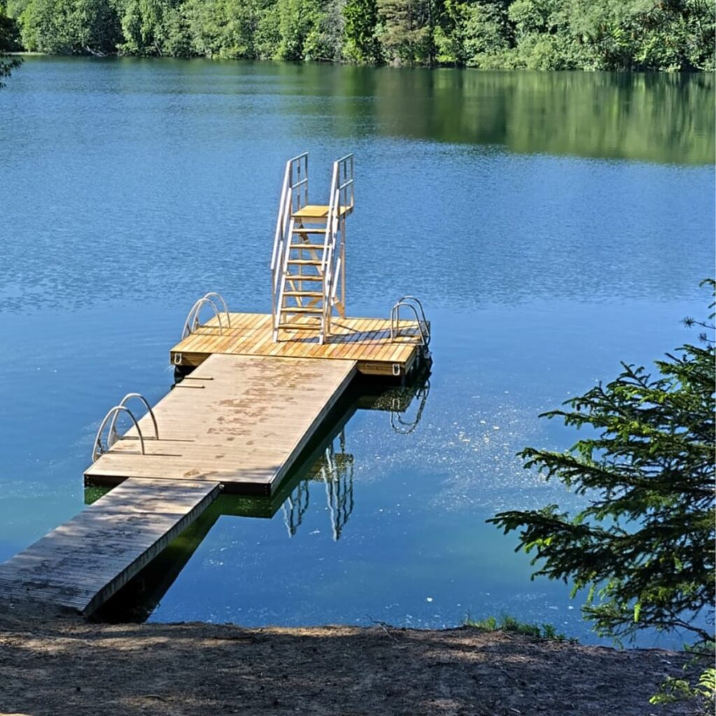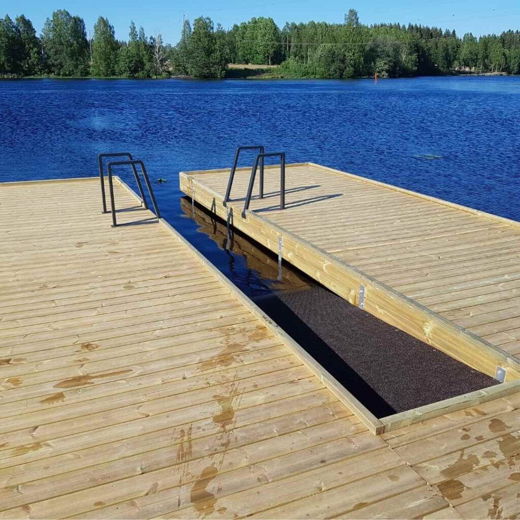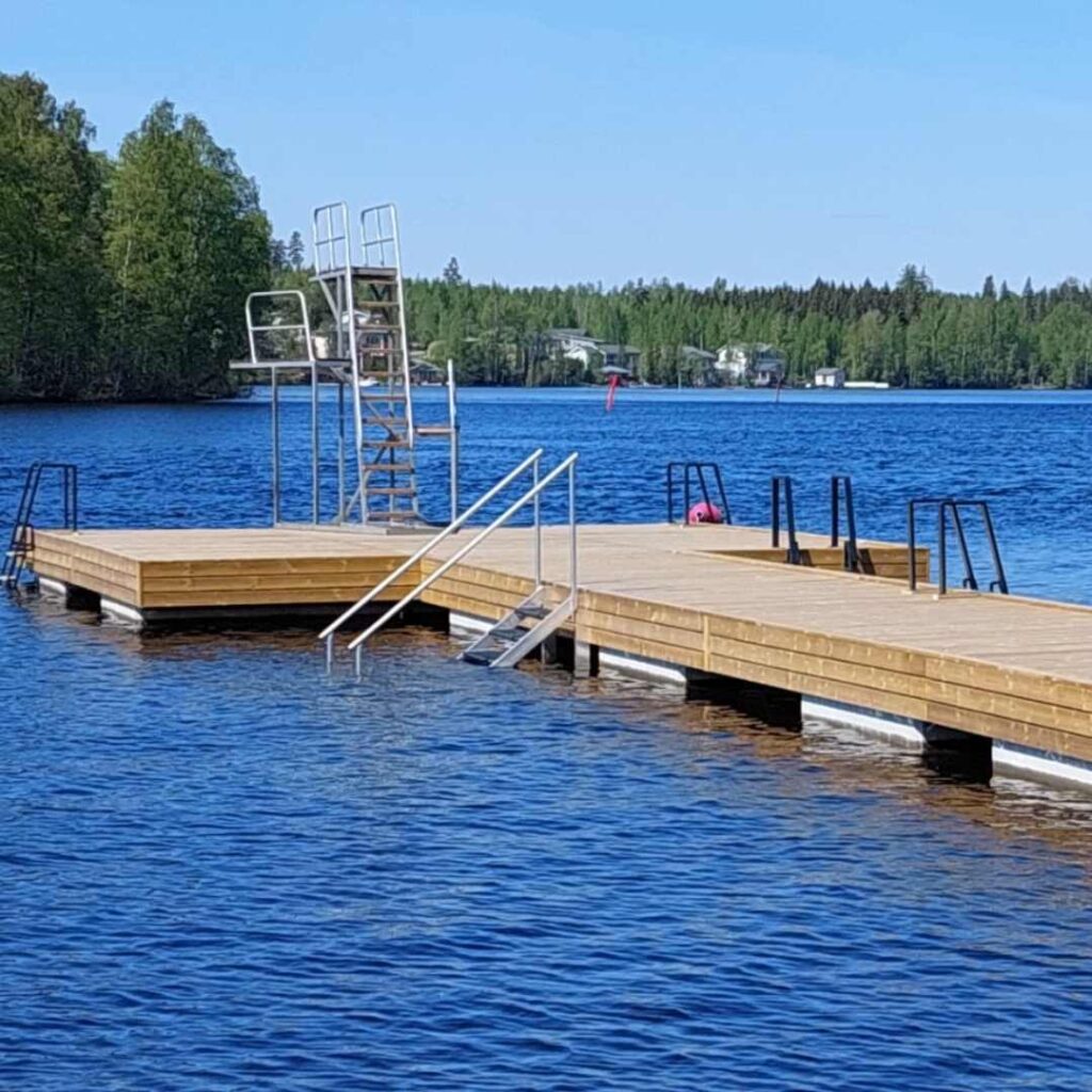Kuikkalammen uimalaituria jatkettiin 2024 Mökki-P 4 x 3.15 m laiturilla. Samalla vaihdettiin aikaisempi 1 m hyppytaso 2 m tasoksi.
