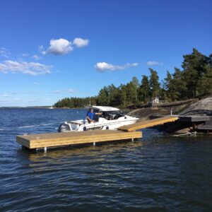 Jami on tukevilla ponttoneilla varustettu leveä kelluva laituri. Se sopii mökkirantaan uimalaituriksi tai veneenkiinnityslaituriksi.