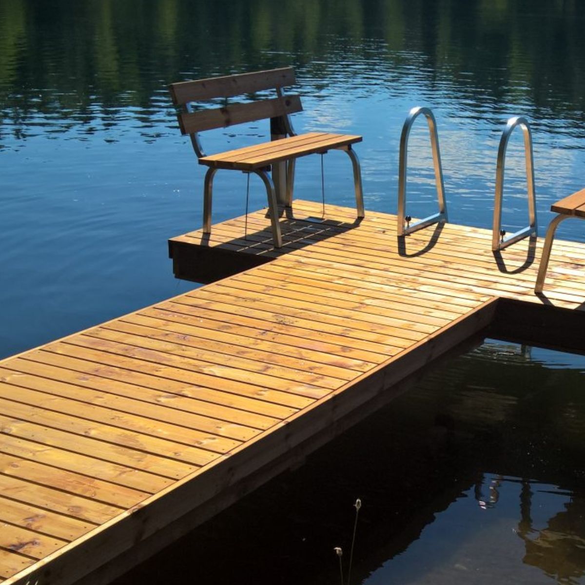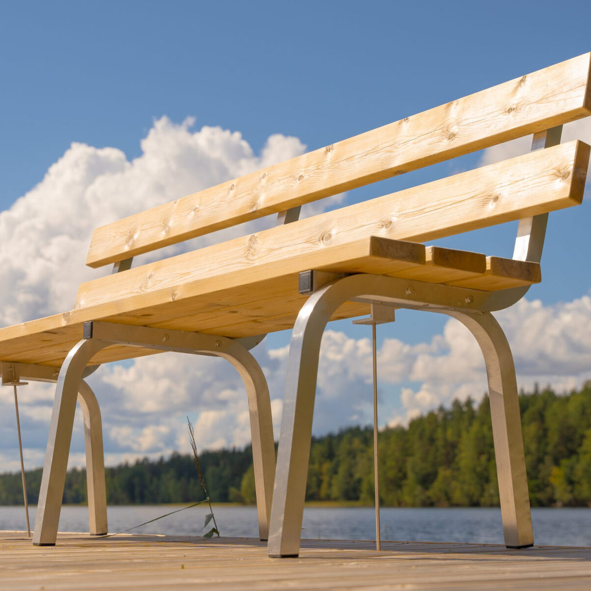 Muotoiltu selkänoja lisää istuinmukavuutta, ja painekyllästetyt, höylätyt puuosat takaavat pitkän käyttöiän ulko-olosuhteissa. Penkki tarjoaa miellyttävän paikan levähtää, nauttia maisemista ja viettää aikaa laiturilla.