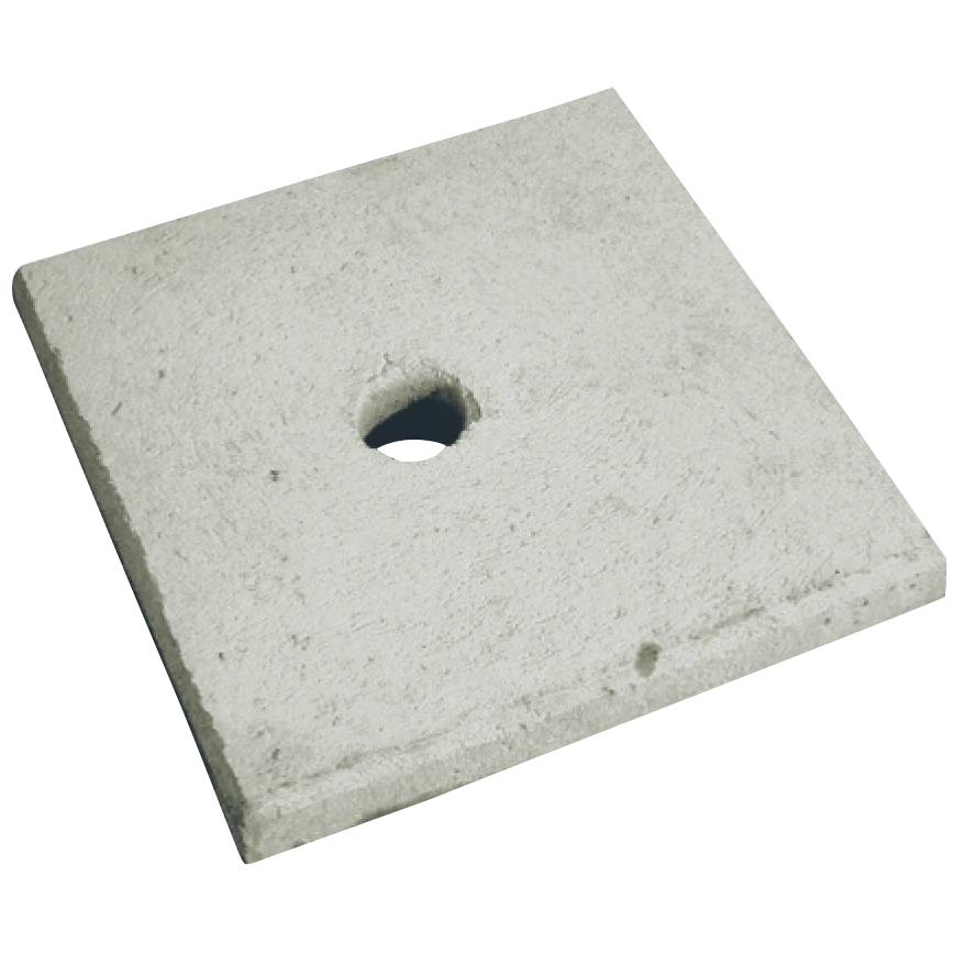 Rakenne: tukiraudoitettu betoni. Neliönmallinen laatta, jossa reikä keskellä.