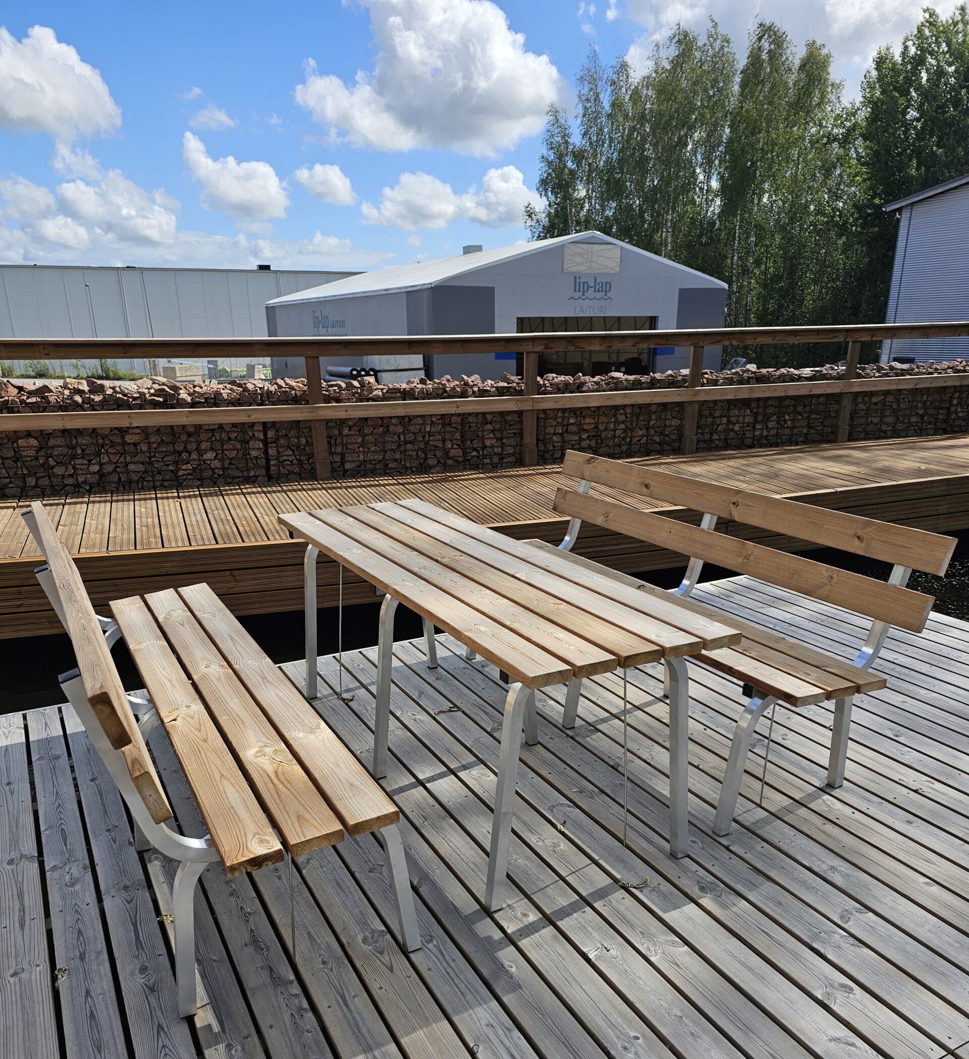 Kestävä, painekyllästetty ja höylätty puupinta antaa tilaa puuhailulle laiturilla. Pöydät ovat mitoitettu penkeille sopivaksi, ja pöydän korkeus on 61 cm ja leveys 50 cm.