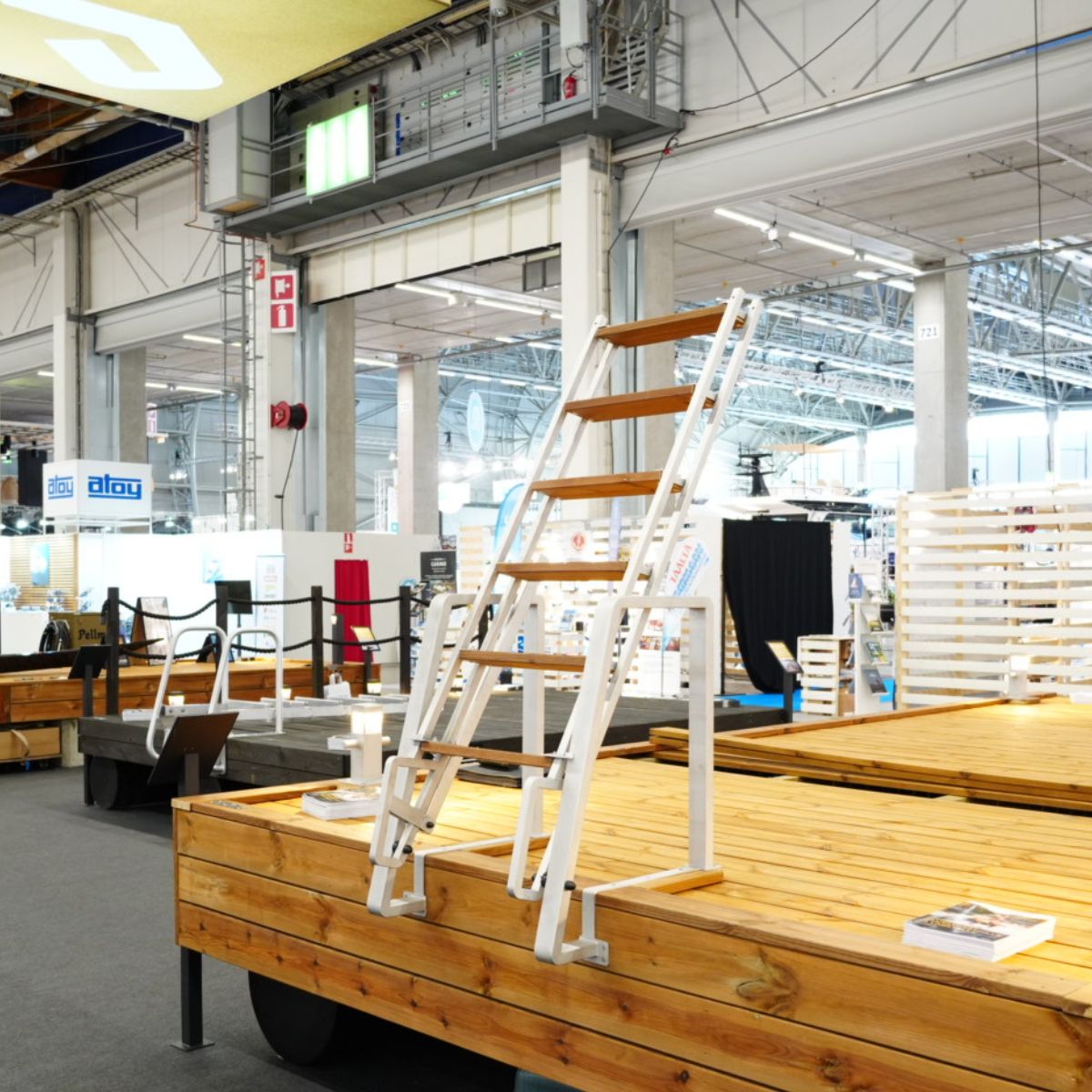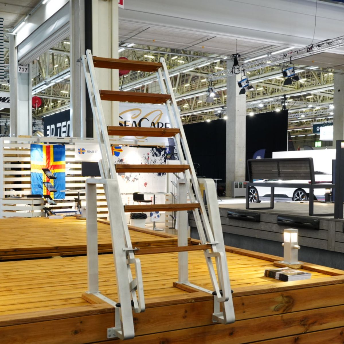 Kääntyvä uimaporras laiturille haponkestävästä teräksestä satiinipinnalla – saatavilla 5-, 6- ja 8-askelmaisena. Mattamainen satiinipinta on tyylikäs eikä siinä näy naarmut tai lika helposti. Leveät ja tukevat askelmat sekä 18° kallistuskulma tekevät vedestä noususta turvallista ja miellyttävää. Puuosat vihreää tai ruskeaa painekyllästettyä mäntyä. Kääntyvä rakenne helpottaa huoltoa ja pidentää käyttöikää