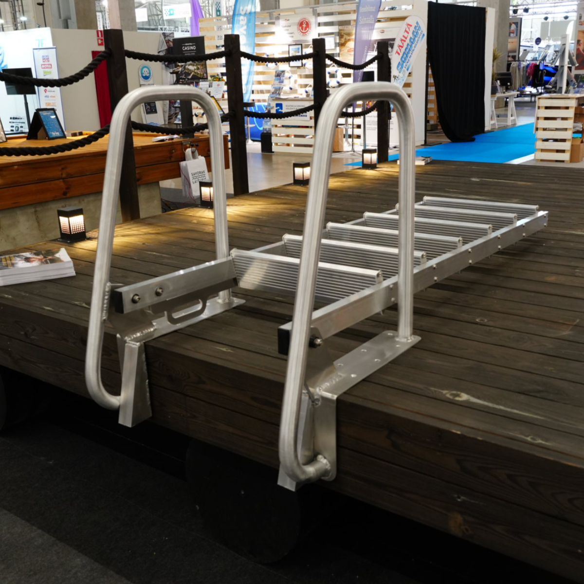 Erittäin laadukkaat, merivedenkestävästä alumiinista valmistetut taittuvat uimaportaat. Kallistuskulman ansiosta myös iäkkäämpien henkilöiden on helppo ja turvallinen pulahtaa uimaan ja sieltä takaisin.
