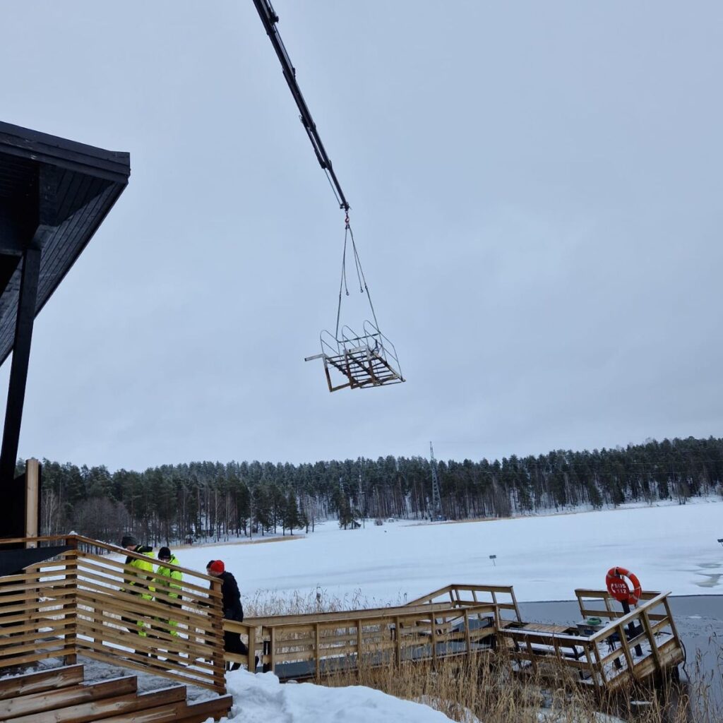 Laiturin toimitus ja asennus sujuivat mallikkaasti. Yhteistyö Savorakin kanssa oli sujuvaa, ja ratkaisut löytyivät helposti. ”Kaikki sujui nappiin. Keskustelimme ja sovimme Tomin kanssa yksityiskohdista, ja lopputulos vastasi odotuksiamme täysin,” toteaa asiakas. Ainoa pieni huomio liittyi rannalle jääneisiin purkujätteisiin, mutta muuten prosessi sai kiitosta asiantuntevasta ja ratkaisukeskeisestä toiminnasta. Toimitettu laituri ja sen varusteet suunniteltiin huolellisesti vastaamaan yhdistyksen tarpeita. Laiturina toimii tukeva, kovan käytön kestävä putkiponttonilaituri (6 x 2,4 metriä), ja siihen on yhdistetty turvallisuutta lisäävä, puukaiteilla varusteltu kulkusilta (1,49 x 5 metriä). Uimareiden mukavuuden ja turvallisuuden takaavat avantouintiportaat, joissa on leveät, lämmitetyt askelmat sekä kaidelämmitys.